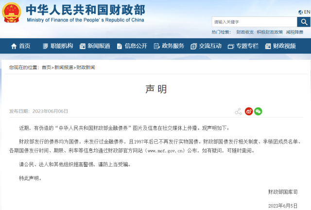 央視網(wǎng)消息:6月6日,財(cái)政部網(wǎng)站發(fā)布聲明,近期,有偽造的“中華人民共和國(guó)財(cái)政部金融債券”圖片及信息在社交媒體上傳播?,F(xiàn)聲明如下: