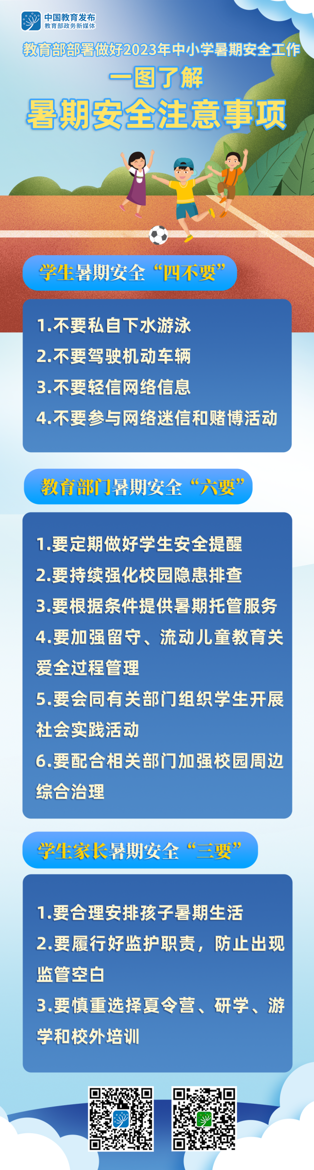 暑假來臨,教育部近日印發(fā)《關(guān)于做好2023年中小學(xué)暑期安全工作的通知》,部署做好相關(guān)工作。和教育小微通過一組大圖了解暑期安全注意事項↓↓↓