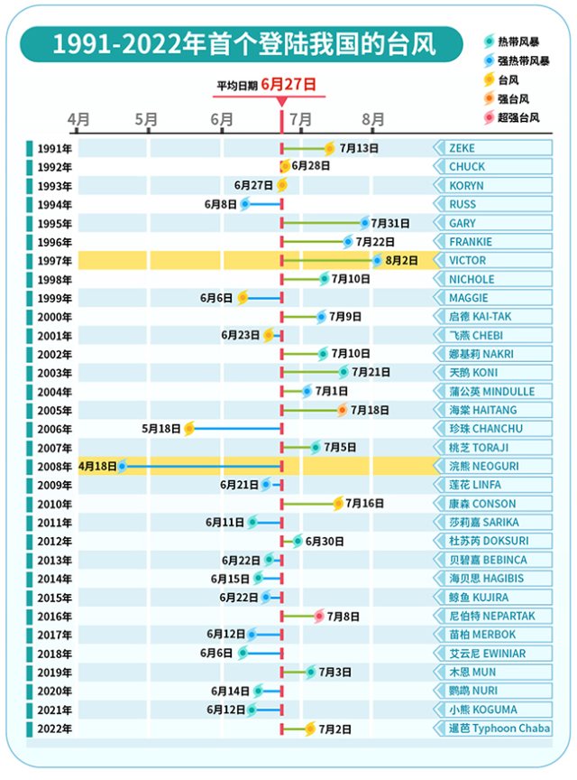 1991-2022年首個(gè)登陸我國的臺風(fēng)名稱、登陸日期及登陸時(shí)強(qiáng)度 丁茜制圖