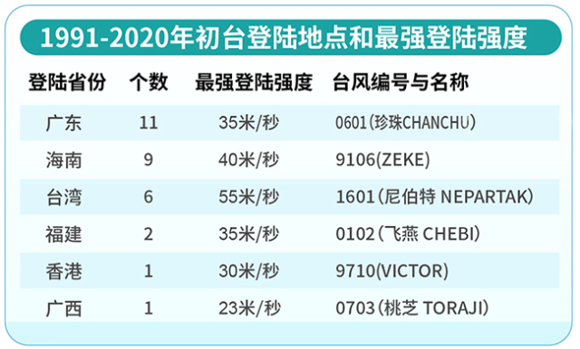 預(yù)計(jì),臺風(fēng)“泰利”將在廣東陽江到海南文昌一帶沿海登陸,那么常年初臺更“青睞”在哪里“上岸”呢?通過常年統(tǒng)計(jì)數(shù)據(jù)我們可以看到,初臺一般在華南等低緯度沿海地區(qū)登陸,初臺最常登陸地為廣東?。?1個(gè))、海南?。?個(gè))和臺灣?。?個(gè))。