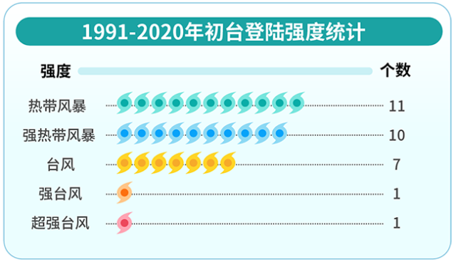 1991-2020年初臺登陸強(qiáng)度統(tǒng)計(jì) 丁茜制圖