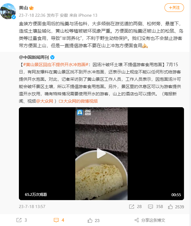 央視網(wǎng)消息:據(jù)@黃山 微博消息,7月18日晚,黃山風景區(qū)官方微博發(fā)文回應不提供開水沖泡面:盒裝方便面食用后的殘羹與湯包料,大多傾倒在游覽道的兩側(cè)、松樹旁、懸崖下,造成土壤鹽堿化,黃山松等植被破壞現(xiàn)象嚴重。方便面的殘羹還被山上的松鼠、鳥類等過量食用,導致“半飼養(yǎng)化”,不利于野生動物保護。我們沒有也不會禁止游客帶方便面上山,但是一直提倡游客不要在山上沖泡方便面食用。