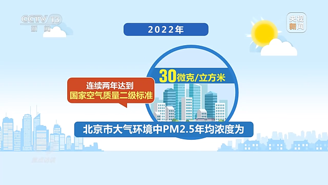 黨的十八大以來,北京市堅決打好污染防治攻堅戰(zhàn),大力壓減燃煤、治理機動車排放、揮發(fā)性有機物以及各類揚塵污染,實施“一微克”行動,治理成效顯著,藍天越來越多。監(jiān)測結果顯示,2022年,北京市大氣環(huán)境中PM2.5年均濃度為每立方米30微克,比2013年下降了66.5%,連續(xù)兩年達到國家空氣質量二級標準。重污染天數由2013年的58天減少到2022年的3天,“北京藍”成為常態(tài)。