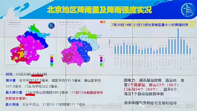 7月31日,微博賬號(hào)“中國(guó)氣象愛(ài)好者”發(fā)布消息稱(chēng),北京西部大量氣象站因特大暴雨導(dǎo)致電力通信和設(shè)備故障失聯(lián),目前北京西部雨情無(wú)法獲知,這是2012年“7·21”、2016年“7·20”暴雨過(guò)程都沒(méi)有出現(xiàn)過(guò)的嚴(yán)峻情況。