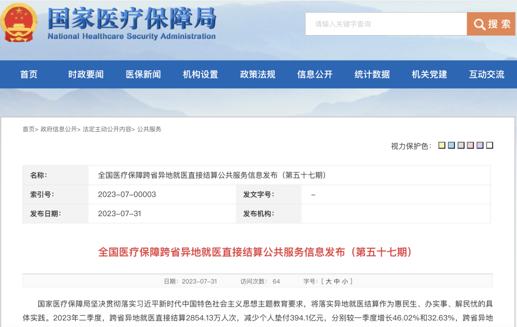 此外,住院費用跨省直接結(jié)算規(guī)模進(jìn)一步增長。截至2023年二季度末,全國住院費用跨省聯(lián)網(wǎng)定點醫(yī)療機(jī)構(gòu)達(dá)7.44萬家,較一季度末增長0.69萬家。2023年二季度,住院費用跨省直接結(jié)算282.57萬人次。