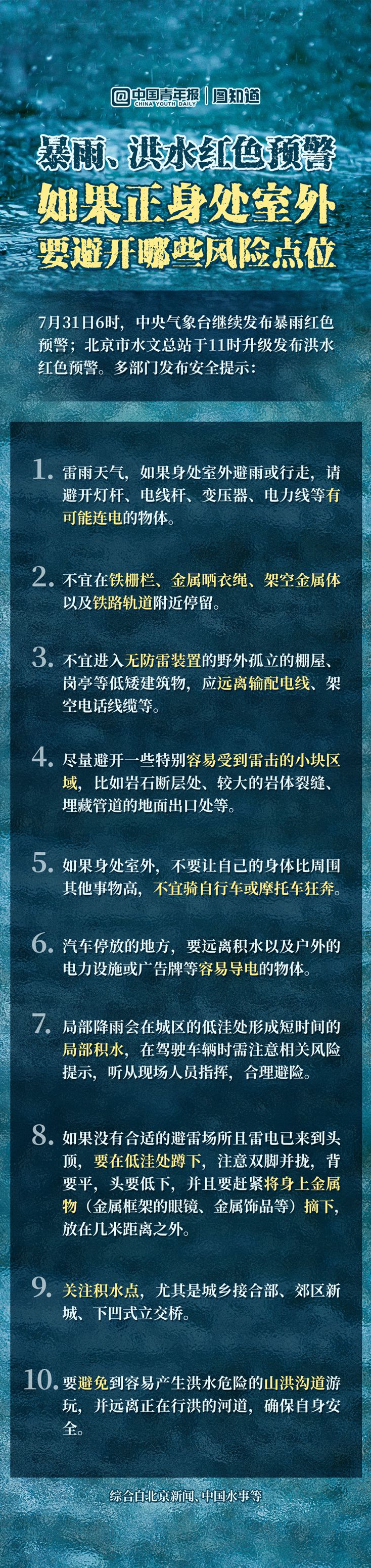 7月31日6時,中央氣象臺繼續(xù)發(fā)布暴雨紅色預警。北京市水文總站于當日11時升級發(fā)布洪水紅色預警。如果遇到暴雨、洪水時恰好身處室外,應避開哪些風險點位?學習科普知識,安全度汛。