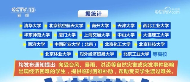 據(jù)統(tǒng)計,清華大學、北京航空航天大學、南開大學、天津大學、西北工業(yè)大學、華東師范大學、廈門大學、上海交通大學、中山大學、大連理工大學、同濟大學、中國礦業(yè)大學(北京)、北京化工大學、北京科技大學、北京林業(yè)大學、對外經(jīng)濟貿(mào)易大學、北京工業(yè)大學等高校均發(fā)布通知提出,向受臺風、暴雨、洪澇等自然災害或突發(fā)事件影響出現(xiàn)經(jīng)濟困難的學生,提供臨時困難補助,幫助受災學生渡過難關。