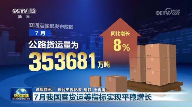 353681萬噸。交通運(yùn)輸部發(fā)布數(shù)據(jù),7月,公路貨運(yùn)量為353681萬噸,同比增長8%;水路貨運(yùn)量為78964萬噸,同比增長6.9%??瓦\(yùn)方面,7月公路客運(yùn)量為40798萬人,同比增長19.3%;水路客運(yùn)量為3034萬人,同比增長78.3%。