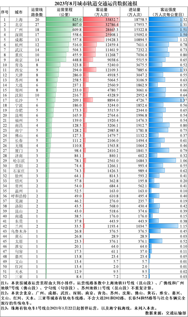 央視網(wǎng)消息:交通運(yùn)輸部發(fā)布2023年8月城市軌道交通運(yùn)營數(shù)據(jù)速報(bào),2023年8月,31個(gè)省(自治區(qū)、直轄市)和新疆生產(chǎn)建設(shè)兵團(tuán)共有54個(gè)城市開通運(yùn)營城市軌道交通線路297條,運(yùn)營里程9771.8公里,實(shí)際開行列車325萬列次,完成客運(yùn)量27.1億人次,進(jìn)站量16.3億人次。8月份,客運(yùn)量環(huán)比增加0.4億人次、增長1.7%,同比增加7.5億人次、增長38.4%,較2019年月均客運(yùn)量增加7.2億人次、增長36.0%。8月份客運(yùn)強(qiáng)度平均水平為0.556萬人次每公里日,較2019年全年客運(yùn)強(qiáng)度平均水平增長1.9%。