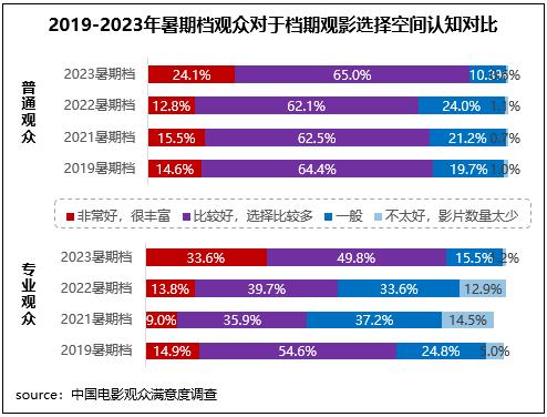 2023年7-8月新上映影片共80部,為近四年來同期最高值,滿意度調(diào)查的13部影片涵蓋劇情、動(dòng)畫、奇幻、懸疑、愛情、喜劇、動(dòng)作等多元類型,給觀眾帶來多樣化的觀影選擇。調(diào)研數(shù)據(jù)顯示,不同觀眾對于檔期觀影選擇空間均給予了好評,普通觀眾、專業(yè)觀眾認(rèn)為檔期觀影選擇“非常好,很豐富”和“比較好,選擇比較多”的占比合計(jì)分別達(dá)89.2%、83.4%,均為近五年同期最高。