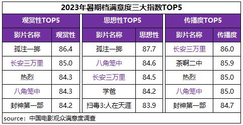 中國電影觀眾滿意度調(diào)查 2023年暑期檔調(diào)查結(jié)果顯示,暑期檔電影觀眾滿意度得分84.5分,較“五一”檔增長1.2分。檔期豐富多元的影片內(nèi)容得到了觀眾的高滿意度評價(jià),調(diào)查的13部影片悉數(shù)進(jìn)入“滿意”區(qū)間(≥80分),有6部影片滿意度超84分,數(shù)量及占比居歷年同期之最。其中《孤注一擲》《長安三萬里》分別以86.4分、85.1分為檔期滿意度單片冠亞軍,《八角籠中》《茶啊二中》《熱烈》和《封神第一部》四部影片滿意度均超84分。2023年暑期檔高滿意度佳作迭出,市場驚喜不斷,觀影氛圍持續(xù)火熱。