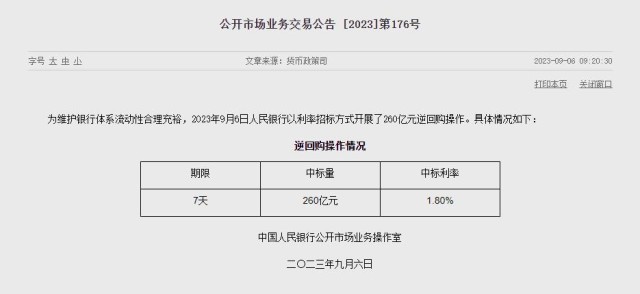 央視網(wǎng)消息:據(jù)央行網(wǎng)站消息,2023年9月6日人民銀行以利率招標(biāo)方式開展了260億元逆回購操作。