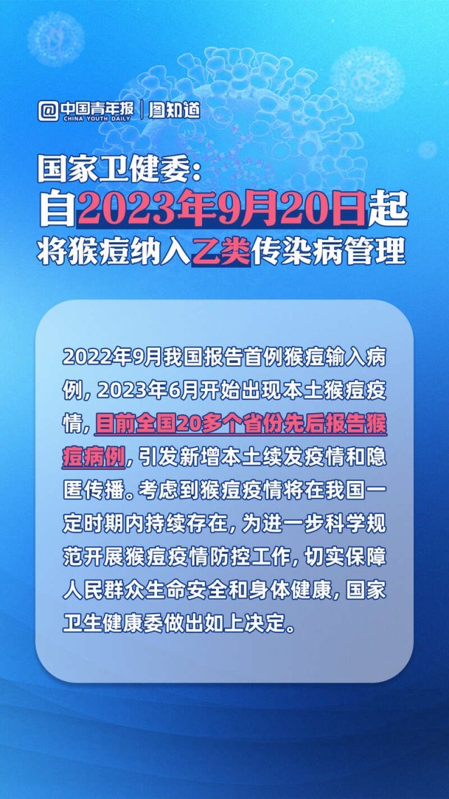 今年以來,我國已有20多個省份先后報告猴痘病例,引發(fā)新增本土續(xù)發(fā)疫情和隱匿傳播。國家衛(wèi)健委9月15日發(fā)布公告稱,自2023年9月20日起將猴痘納入乙類傳染病進行管理,采取乙類傳染病的預(yù)防、控制措施。
