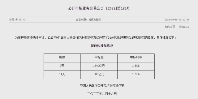 央視網(wǎng)消息:中國人民銀行發(fā)布公告,為維護(hù)季末流動性平穩(wěn),9月18日以利率招標(biāo)方式開展2440億元7天期和14天期逆回購操作。