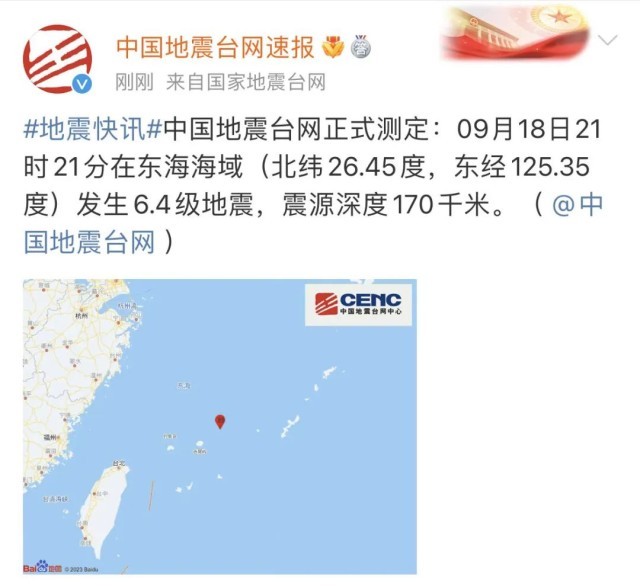 此前,經(jīng)中國(guó)地震臺(tái)網(wǎng)自動(dòng)測(cè)定:09月18日21時(shí)21分在中國(guó)臺(tái)灣東北附近(北緯26.30度,東經(jīng)125.38度)發(fā)生6.7級(jí)左右地震(最終結(jié)果以正式速報(bào)為準(zhǔn))。