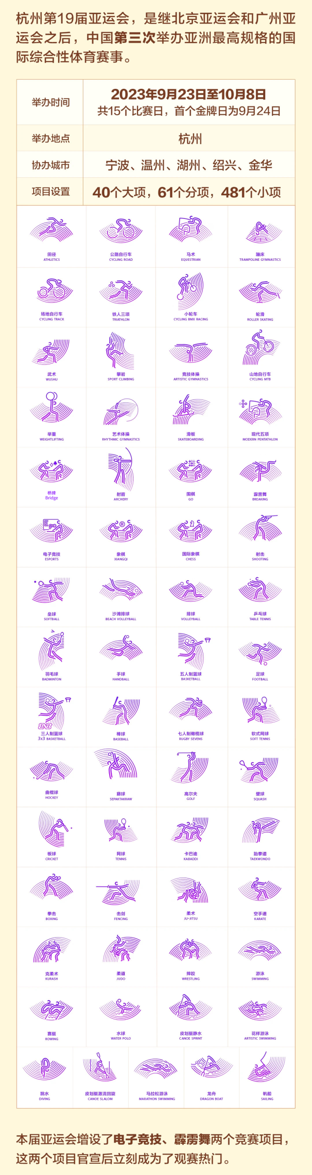 接下來(lái)跟著小編一起,一圖了解杭州亞運(yùn)會(huì)吧↓