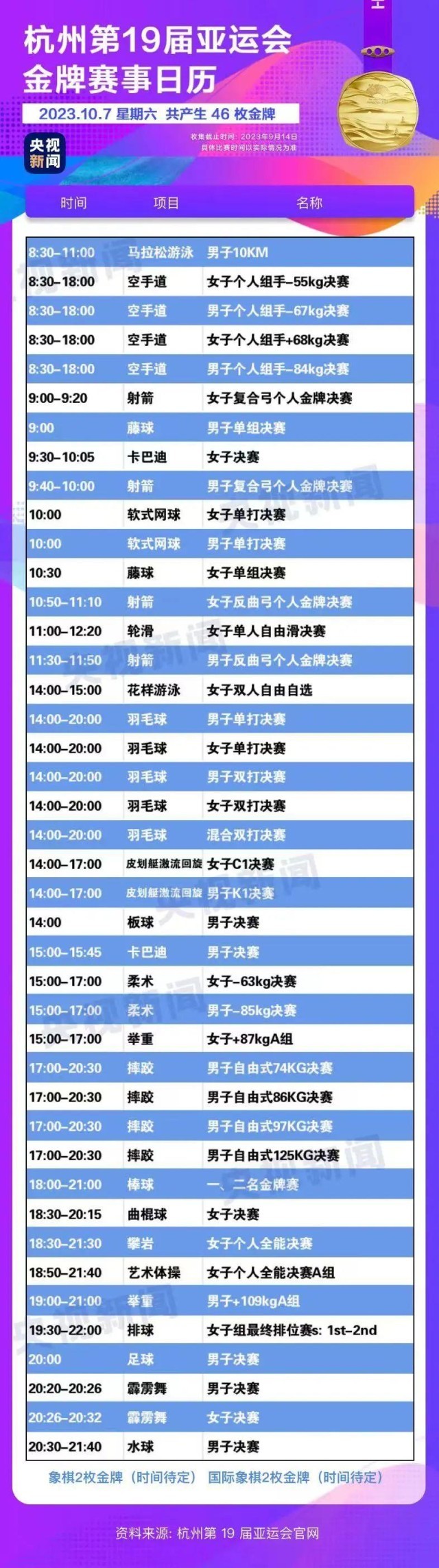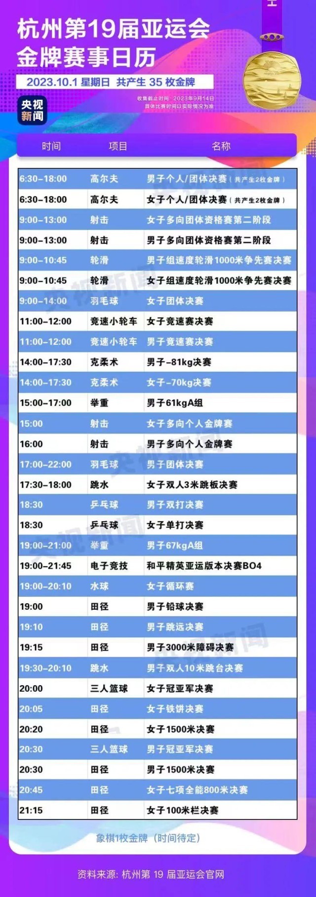 最后,小編還為你準(zhǔn)備了一份杭州亞運(yùn)會(huì)金牌賽事日歷,日歷里包含所有481枚金牌產(chǎn)生的時(shí)間?;瑒?dòng)手指,看看你關(guān)注的比賽在哪天舉行。