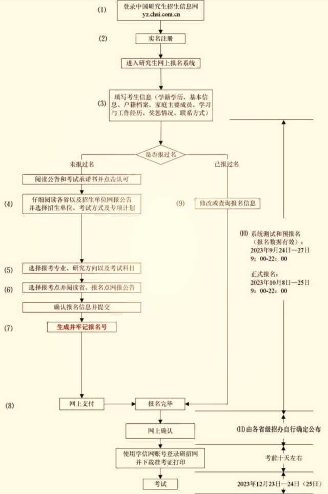 ?。?)考生應(yīng)在規(guī)定時(shí)間登錄“中國研究生招生信息網(wǎng)”(網(wǎng)址:https://yz.chsi.com.cn)瀏覽報(bào)考須知,并按省級教育招生考試機(jī)構(gòu)、報(bào)考點(diǎn)以及報(bào)考招生單位的網(wǎng)上公告要求報(bào)名;