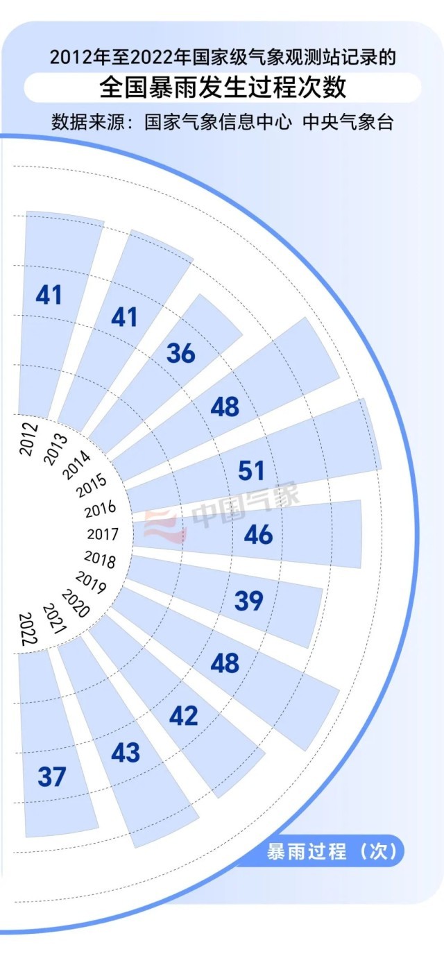 我們通過數(shù)據(jù)了解下我國近年來的暴雨發(fā)生頻次。2012年至2022年間,我國共發(fā)生暴雨天氣過程472次,年均發(fā)生次數(shù)約為42.9次;2016年暴雨發(fā)生次數(shù)最多,為51次;2014年最少,為36次(2023年未結束,暫不計)。