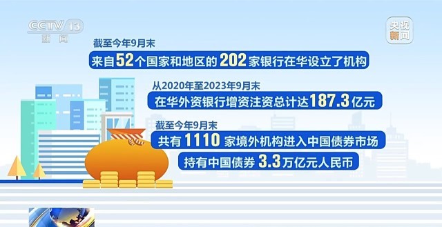 金融開放步伐加快。截至今年9月末,來自52個(gè)國(guó)家和地區(qū)的202家銀行在華設(shè)立了機(jī)構(gòu);從2020年至2023年9月末,在華外資銀行增資注資總計(jì)達(dá)187.3億元。截至今年9月末,共有1110家境外機(jī)構(gòu)進(jìn)入中國(guó)債券市場(chǎng),持有中國(guó)債券3.3萬億元人民幣。