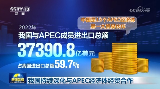 央視網(wǎng)消息(新聞聯(lián)播):商務(wù)部最新數(shù)據(jù)顯示,2022年,我國與APEC成員進(jìn)出口總額為37390.8億美元,占我國進(jìn)出口總額的59.7%。中國是13個APEC經(jīng)濟(jì)體的第一大貿(mào)易伙伴。