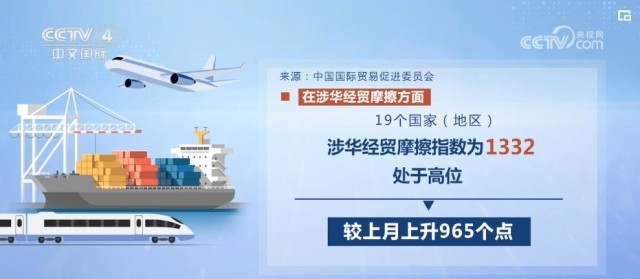 在涉華經(jīng)貿(mào)摩擦方面,19個(gè)國家(地區(qū))涉華經(jīng)貿(mào)摩擦指數(shù)為1332,處于高位,較上月上升965個(gè)點(diǎn)。