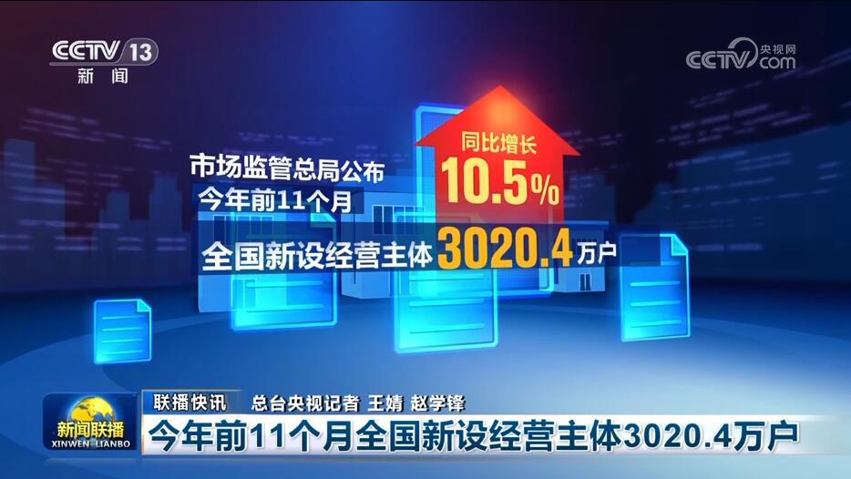 今年前11個(gè)月全國(guó)新設(shè)經(jīng)營(yíng)主體3020.4萬(wàn)戶(hù)