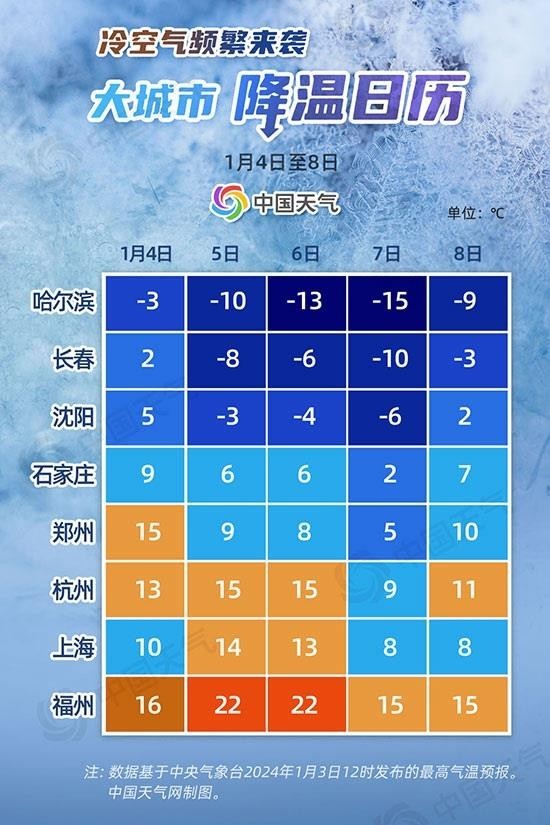 從這份大城市降溫日歷來看,5日開始,受冷空氣影響,降溫將自北向南展開,東北地區(qū)降溫最猛且連降三天,沈陽(yáng)、長(zhǎng)春的最高氣溫將重回冰點(diǎn)之下。近期已成為旅游熱門地的哈爾濱,降溫最為猛烈,6日至7日,最低氣溫將在-25℃左右,最高氣溫跌至近期低點(diǎn),達(dá)-15℃左右,天寒地凍一整天。近期有計(jì)劃去當(dāng)?shù)赜瓮娴哪戏叫』锇閭?,一定要帶好厚衣服,戶外活?dòng)帽子、手套、雪地靴從頭到腳捂嚴(yán)實(shí)。