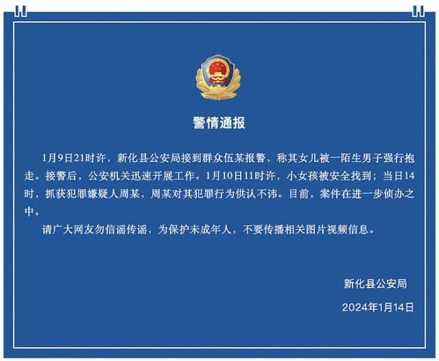 央視網(wǎng)消息:據(jù)“新化公安”公眾號(hào)消息,湖南新化縣公安局1月14日晚發(fā)布警情通報(bào),1月9日21時(shí)許,新化縣公安局接到群眾伍某報(bào)警,稱其女兒被一陌生男子強(qiáng)行抱走。接警后,公安機(jī)關(guān)迅速開展工作。1月10日11時(shí)許,小女孩被安全找到;當(dāng)日14時(shí),抓獲犯罪嫌疑人周某,周某對(duì)其犯罪行為供認(rèn)不諱。目前,案件在進(jìn)一步偵辦之中。