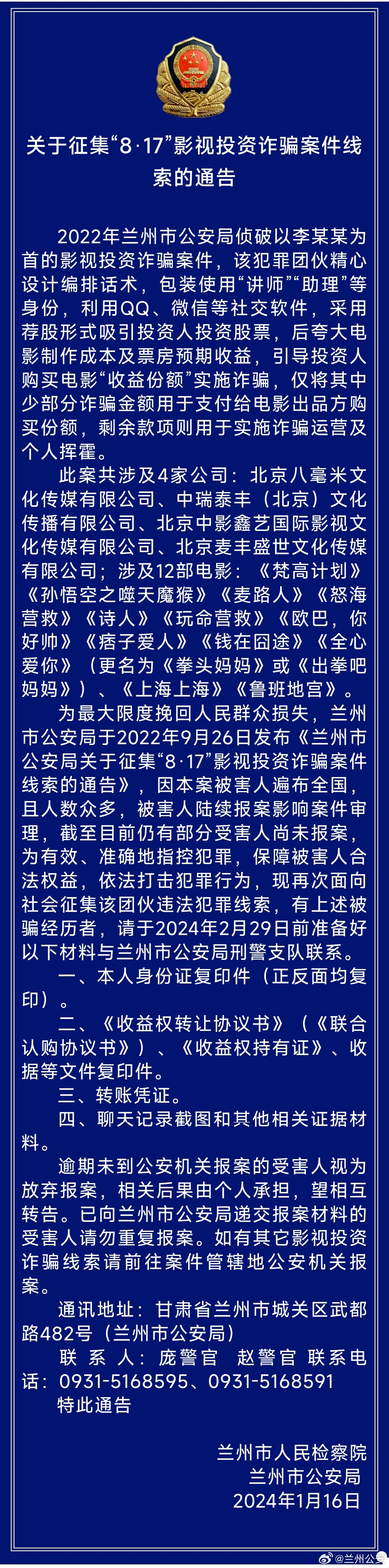 為最大限度挽回人民群眾損失,蘭州市公安局早在2022年9月26日發(fā)布《蘭州市公安局關(guān)于征集“8·17”影視投資詐騙案件線索的通告》,但因本案被害人遍布全國(guó),且人數(shù)眾多,受害人陸續(xù)報(bào)案影響案件審理,截至目前仍有部分受害人尚未報(bào)案。