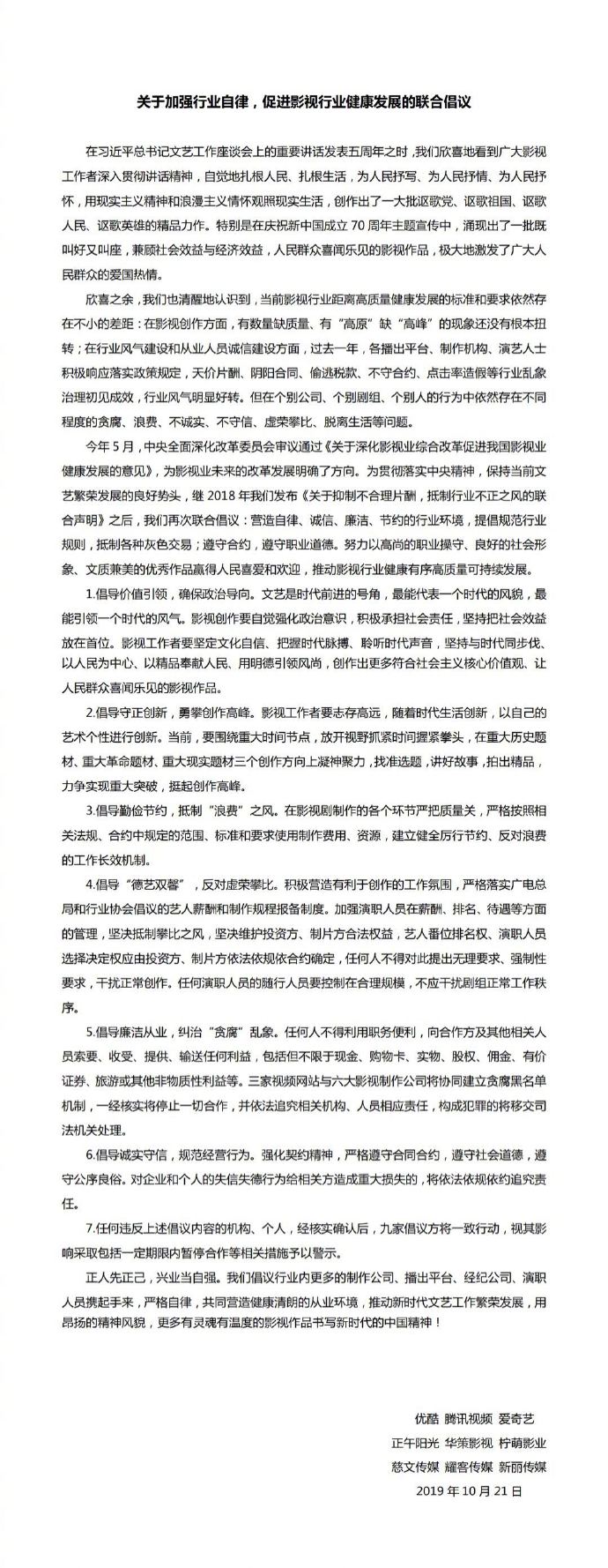 為了避免娛樂圈的爭(zhēng)番、攀比等亂象,業(yè)界公司曾聯(lián)合發(fā)布自律倡議。2019年,優(yōu)酷、騰訊視頻、愛奇藝三家視頻網(wǎng)站,聯(lián)合正午陽(yáng)光、華策影視、檸萌影業(yè)、慈文傳媒、耀客傳媒、新麗傳媒六大影視制作公司,共同發(fā)布《關(guān)于加強(qiáng)行業(yè)自律,促進(jìn)影視行業(yè)健康發(fā)展的聯(lián)合倡議》。
