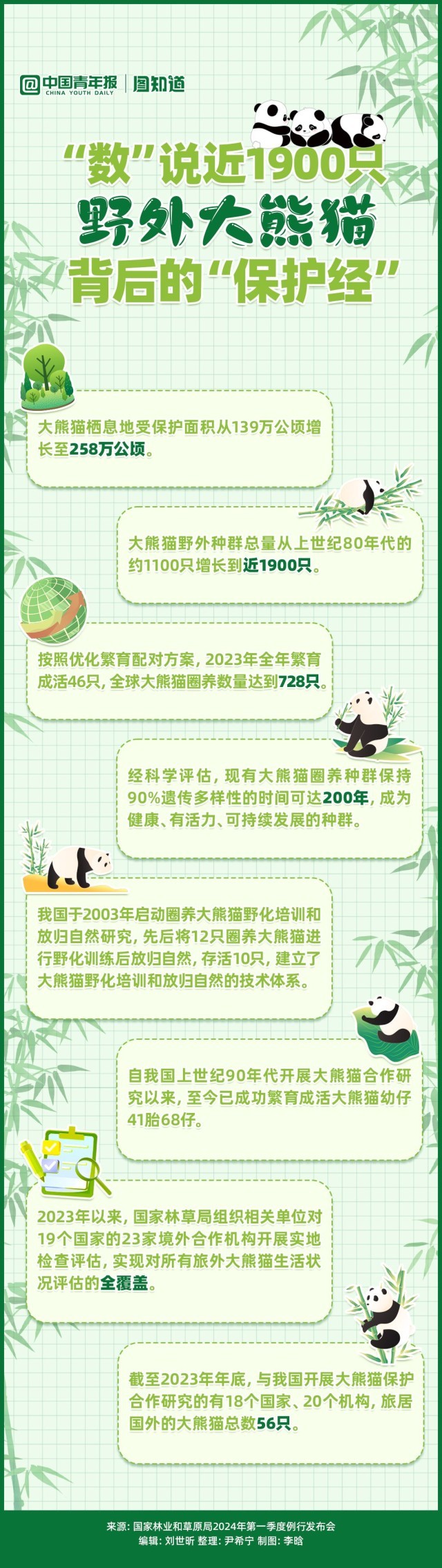 由“瀕?!钡健耙孜!?,我國為“國寶”大熊貓做了哪些保護(hù)工作?國家林業(yè)和草原局2024年第一季度例行發(fā)布會(huì)通報(bào),現(xiàn)有大熊貓圈養(yǎng)種群保持90%遺傳多樣性的時(shí)間可達(dá)200年。此外,我國已實(shí)現(xiàn)對所有旅外大熊貓生活狀況評估的全覆蓋。跟著數(shù)據(jù),一起了解可愛“四腳獸”背后的“保護(hù)經(jīng)”。