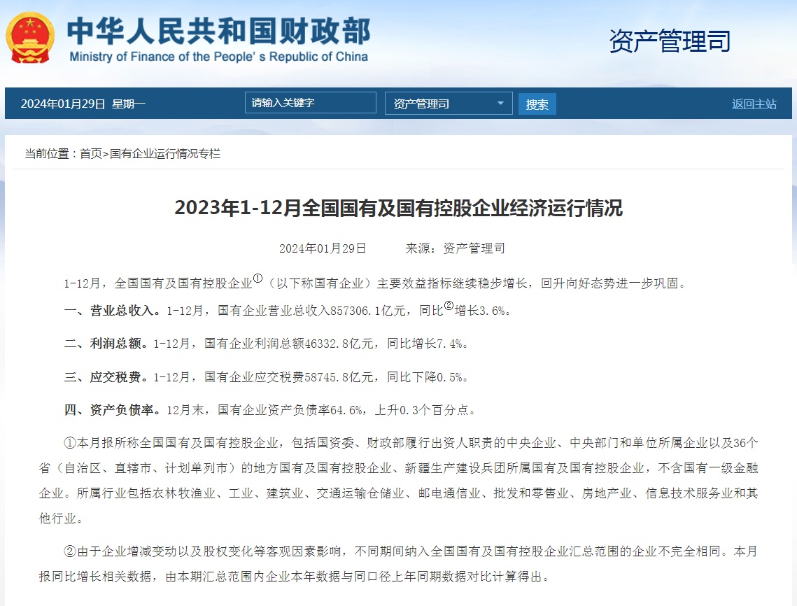 1月29日,財(cái)政部在其官方網(wǎng)站公布2023年1-12月全國國有及國有控股企業(yè)經(jīng)濟(jì)運(yùn)行情況。