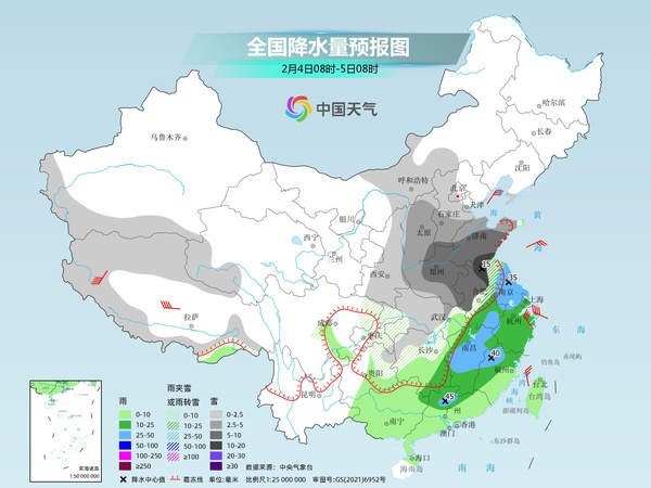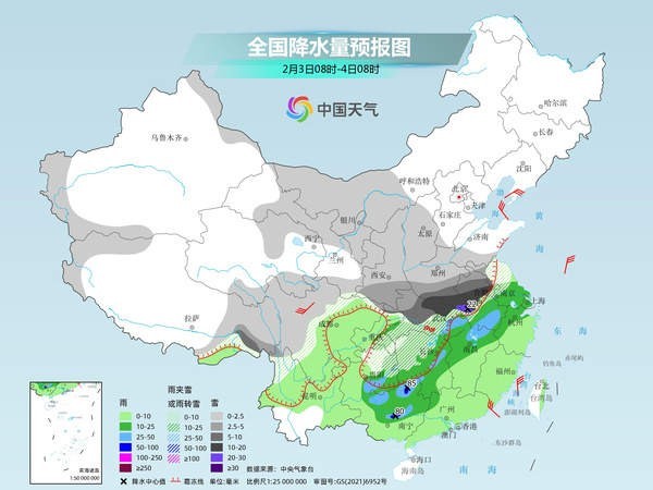 未來三天(2月2日至4日),中東部大范圍雨雪冰凍天氣過程進入鼎盛時段,江漢至黃淮一帶將遭遇強降雪,局地或現(xiàn)大暴雪,江南、華南局地有暴雨,并可能出現(xiàn)強對流天氣。在冷空氣和雨雪天氣共同影響下,中東部多地濕冷感明顯。春運高峰期將至,公眾需注意出行安全,做好防寒保暖措施。