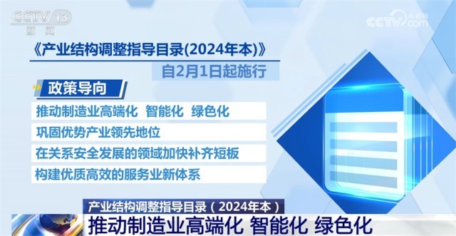 《產(chǎn)業(yè)結(jié)構(gòu)調(diào)整指導(dǎo)目錄(2024年本)》自2月1日起施行?!赌夸洠?024年本)》的政策導(dǎo)向是,推動(dòng)制造業(yè)高端化、智能化、綠色化,鞏固優(yōu)勢(shì)產(chǎn)業(yè)領(lǐng)先地位,在關(guān)系安全發(fā)展的領(lǐng)域加快補(bǔ)齊短板,構(gòu)建優(yōu)質(zhì)高效的服務(wù)業(yè)新體系。