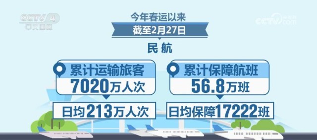1月份,民航全行業(yè)完成運(yùn)輸總周轉(zhuǎn)量116.1億噸公里,同比增長(zhǎng)57.1%;完成旅客運(yùn)輸量5731.8萬人次,同比增長(zhǎng)44.1%,民航客運(yùn)恢復(fù)程度達(dá)到疫情以來月度新高;完成貨郵運(yùn)輸量75.3萬噸,同比增長(zhǎng)53.9%,民航貨運(yùn)規(guī)模連續(xù)六個(gè)月超過疫情前水平。從數(shù)據(jù)看,今年春運(yùn)以來,截至2月27日,民航累計(jì)運(yùn)輸旅客7020萬人次,日均213萬人次;累計(jì)保障航班56.8萬班,日均保障17222班。