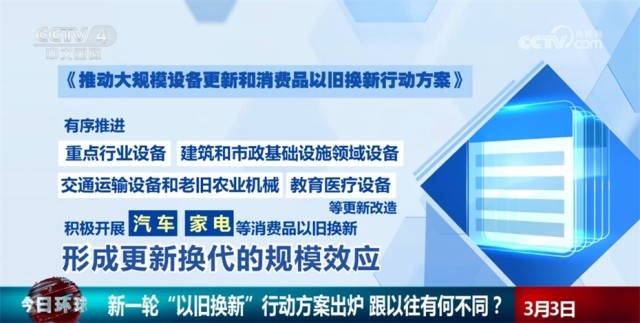 央視網(wǎng)消息:日前,國務(wù)院常務(wù)會(huì)議審議通過了《推動(dòng)大規(guī)模設(shè)備更新和消費(fèi)品以舊換新行動(dòng)方案》。行動(dòng)方案有哪些亮點(diǎn)?新一輪“以舊換新”和以往有什么不同?來看專家的解讀。