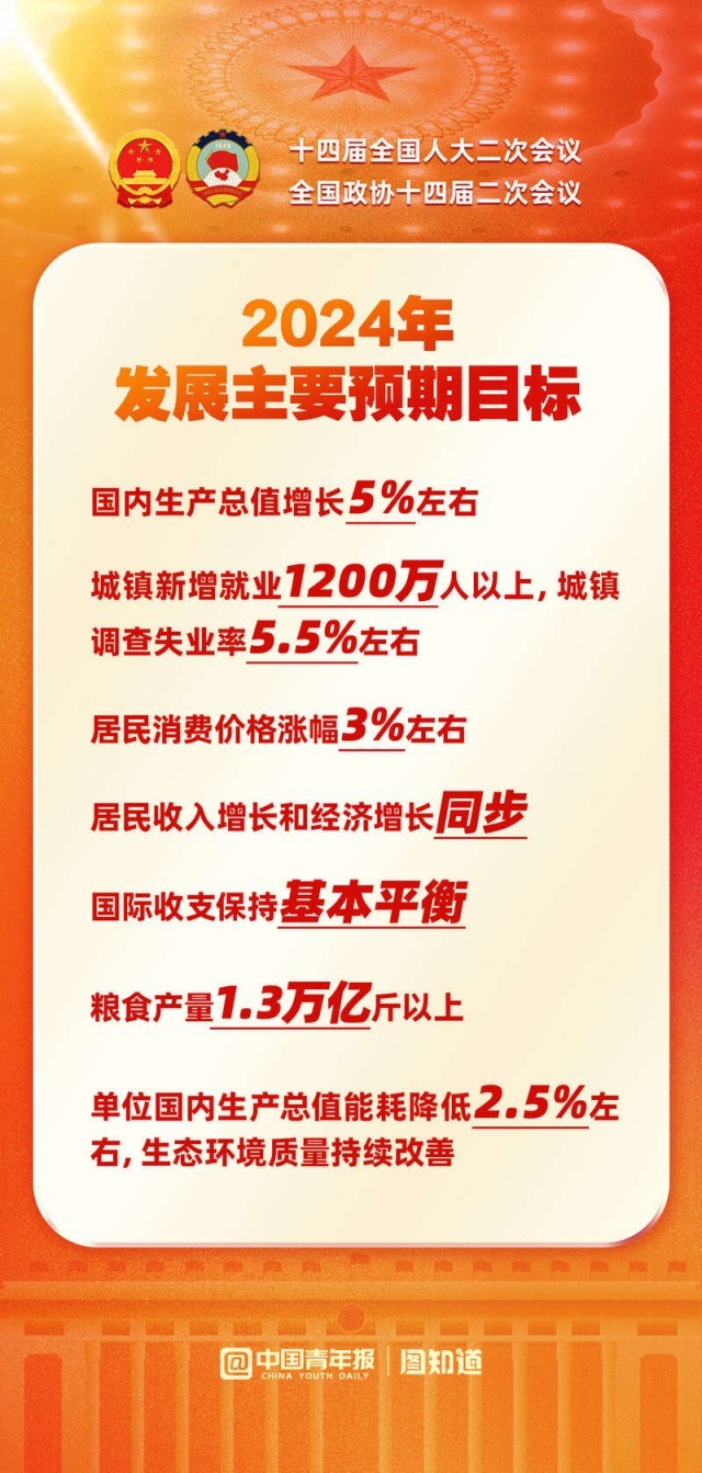 國(guó)內(nèi)生產(chǎn)總值增長(zhǎng)5%左右,城鎮(zhèn)新增就業(yè)1200萬(wàn)人以上,糧食產(chǎn)量1.3萬(wàn)億斤以上......2024年發(fā)展主要預(yù)期目標(biāo)公布,向著這些目標(biāo)共同奮斗!