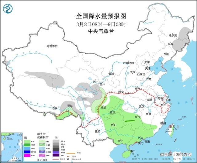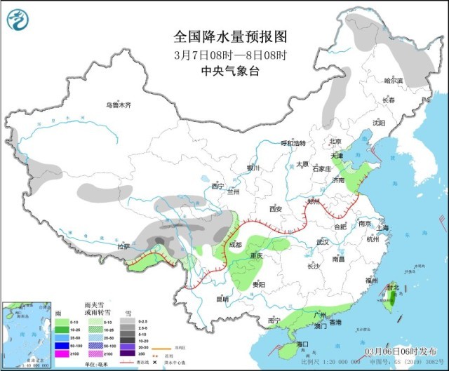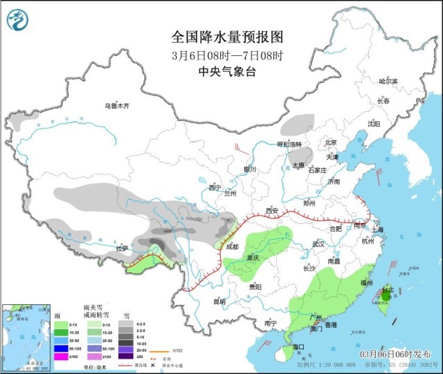 3月6日08時(shí)至7日08時(shí),西藏東部和南部、青海南部、川西高原北部、山西北部等地部分地區(qū)有小雪或雨夾雪,其中,西藏東部、川西高原北部等地部分地區(qū)有中到大雪。江南東部和南部、西南地區(qū)東部、華南中東部、臺(tái)灣島等地部分地區(qū)有小雨,其中,臺(tái)灣島北部等地部分地區(qū)有中雨。內(nèi)蒙古西北部部分地區(qū)有4~5級(jí)風(fēng)(見(jiàn)圖1)。