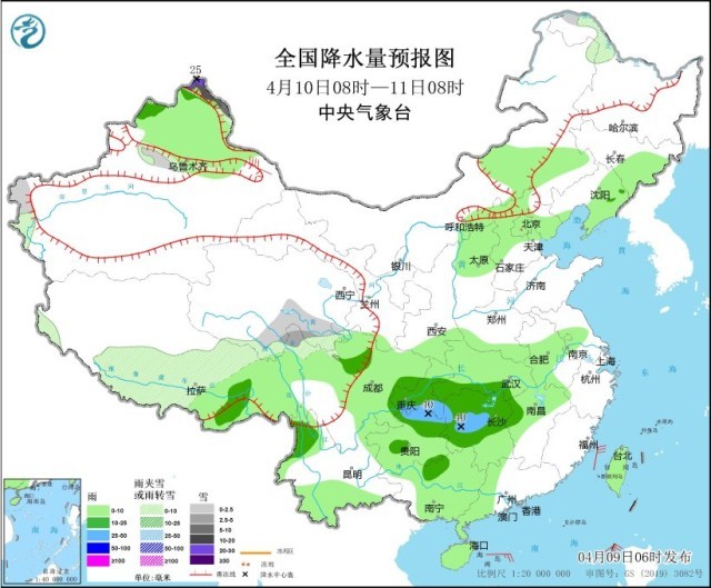 4月9日08時至10日08時,內(nèi)蒙古東北部、黑龍江西北部、新疆北疆北部和伊犁河谷、西藏北部和西部、青海中部和北部、川西高原北部等地部分地區(qū)有小到中雪或雨夾雪,其中,新疆北疆北部等地局部有大到暴雪(10~18毫米)。新疆北部、內(nèi)蒙古中部、華北北部、西藏中部和東南部、青海東部、甘肅中部和南部、寧夏、陜西北部和西南部、四川盆地大部、重慶、湖北西部、貴州北部、湖南北部、云南西部和東南部、廣西東南部、海南島、臺灣島等地部分地區(qū)有小到中雨,其中,西藏東南部局地有大雨(25~30毫米)。新疆北疆沿天山地區(qū)、甘肅西部、內(nèi)蒙古西北部、黑龍江東北部、西藏中部等地部分地區(qū)有4~6級風(fēng)。東海大部海域、臺灣海峽、臺灣以東洋面、巴士海峽、南海東北部海域?qū)⒂?~7級、陣風(fēng)8級的風(fēng),其中臺灣海峽的部分海域風(fēng)力可達8級、陣風(fēng)9級。