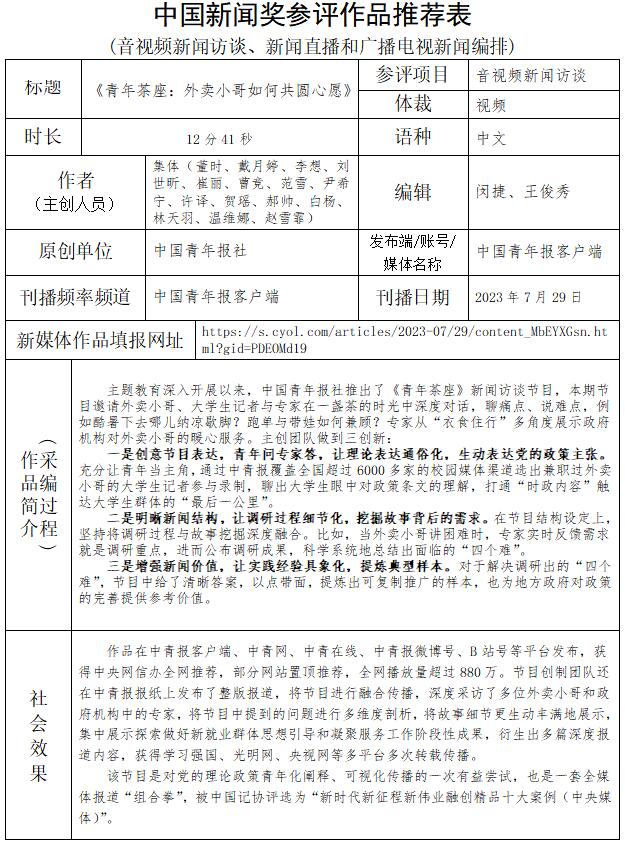 中國青年報社推薦參評第34屆中國新聞獎音視頻新聞訪談、音視頻新聞直播等作品專項初評公示