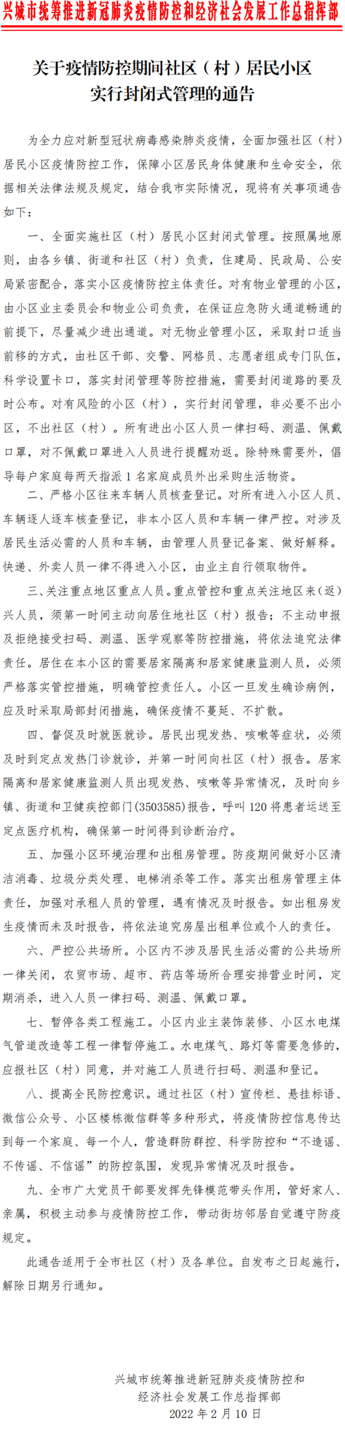 中新網(wǎng)2月11日電 據(jù)興城市政府網(wǎng)站消息,遼寧葫蘆島興城市統(tǒng)籌推進(jìn)新冠肺炎疫情防控和經(jīng)濟(jì)社會發(fā)展工作總指揮部10日發(fā)布通知,即日起,全面實施社區(qū)(村)居民小區(qū)封閉式管理,對有風(fēng)險的小區(qū)(村),實行封閉管理,非必要不出小區(qū),不出社區(qū)(村)。