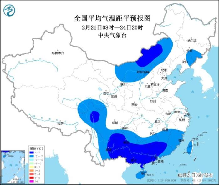 受持續(xù)陰雨雪和冷空氣共同影響,我國南方大部地區(qū)氣溫將顯著偏低。預(yù)計(jì)21日08時(shí)至24日20時(shí),貴州、四川西部和南部、湖南南部、江西中南部、云南東部、廣西、廣東、福建、海南和臺灣島等地的日平均氣溫較歷史同期偏低5℃以上,其中,云南東部、貴州南部、湖南南部、江西南部、廣西大部、廣東中西部等地偏低7℃以上,最低氣溫0℃線將壓至貴州南部、湖南南部、江西北部到浙江南部一帶,4℃線將壓至廣西中部到廣東中部一帶。另外,內(nèi)蒙古中部、吉林、青藏高原東部等地日平均氣溫也較歷史同期偏低5℃,部分地區(qū)偏低7℃。(見圖1、圖2)。