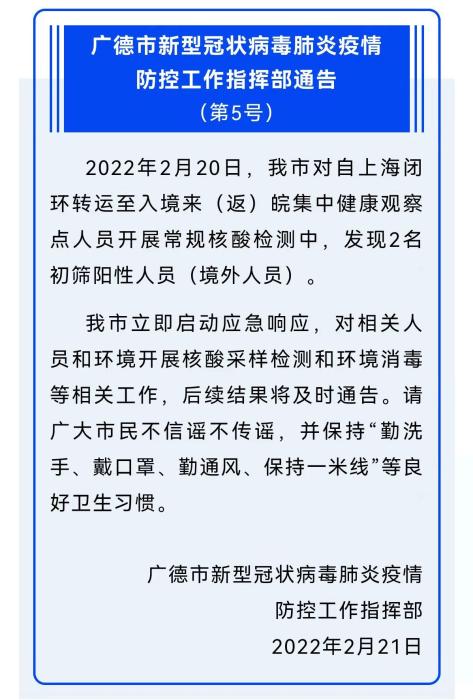 記者從安徽省廣德市新型冠狀病毒肺炎疫情防控工作指揮部獲悉,2月20日,廣德市對自上海閉環(huán)轉(zhuǎn)運至入境來(返)皖集中健康觀察點人員開展常規(guī)核酸檢測中,發(fā)現(xiàn)2名初篩陽性人員(境外人員)。