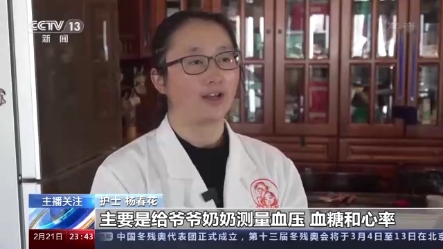 護士 楊春花:每個星期來一次的,主要是給爺爺奶奶測量血壓,血糖和心率,幫他做一下藥物的管理。