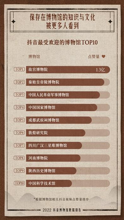報(bào)告顯示,根據(jù)相關(guān)視頻點(diǎn)贊量排序,故宮博物院、秦始皇帝陵博物院、中國人民革命軍事博物館、中國國家博物館、成都武侯祠博物館等入選抖音最受歡迎十大博物館。其中,故宮博物院相關(guān)視頻被抖音網(wǎng)友點(diǎn)贊超過1.3億次。