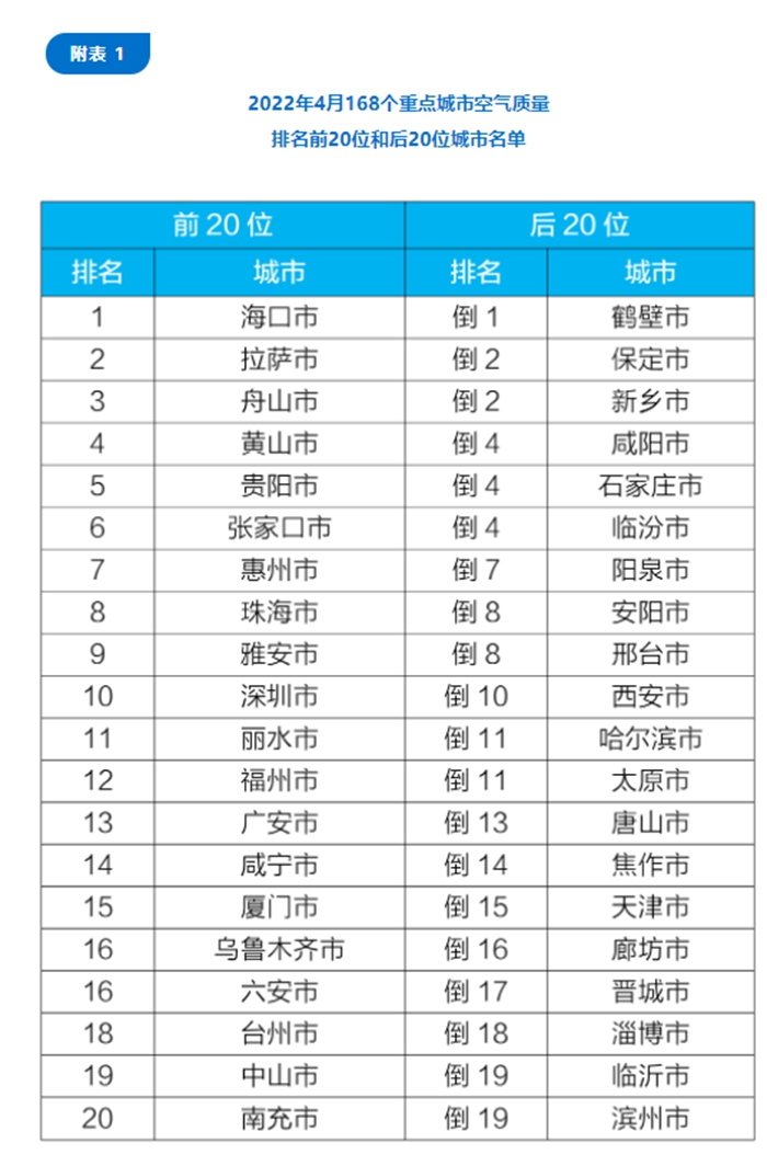 1—4月,168個重點城市中,拉薩、海口和舟山市等20個城市空氣質量相對較好;咸陽、烏魯木齊和西安市等20個城市空氣質量相對較差。(完)