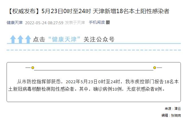 中新網(wǎng)5月24日電 據(jù)天津衛(wèi)健委官方微信消息,從天津市防控指揮部獲悉,2022年5月23日0時(shí)至24時(shí),天津市疾控部門(mén)報(bào)告18名本土新冠病毒核酸檢測(cè)陽(yáng)性感染者。其中,確診病例10例,無(wú)癥狀感染者8例。