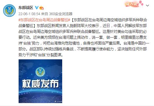 中新網(wǎng)6月1日電 據(jù)中國人民解放軍東部戰(zhàn)區(qū)官方微博1日消息,東部戰(zhàn)區(qū)新聞發(fā)言人施毅陸軍大校表示,近日,中國人民解放軍東部戰(zhàn)區(qū)在臺島周邊海空域組織多軍兵種聯(lián)合戰(zhàn)備警巡。這是針對美臺勾連采取的必要行動。近來美方頻頻在臺灣問題上搞動作,說一套、做一套,明里暗里慫恿支持“臺獨”勢力,將把臺灣推向危險境地,自身也將面臨嚴重后果。臺灣是中國的一部分。戰(zhàn)區(qū)部隊持續(xù)加強練兵備戰(zhàn),不斷提高履行使命能力,堅決挫敗任何外部勢力干涉和“臺獨”分裂圖謀。