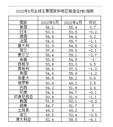 中國物流與采購聯(lián)合會網(wǎng)站發(fā)布的2022年5月份全球主要國家制造業(yè)PMI指數(shù)截圖。